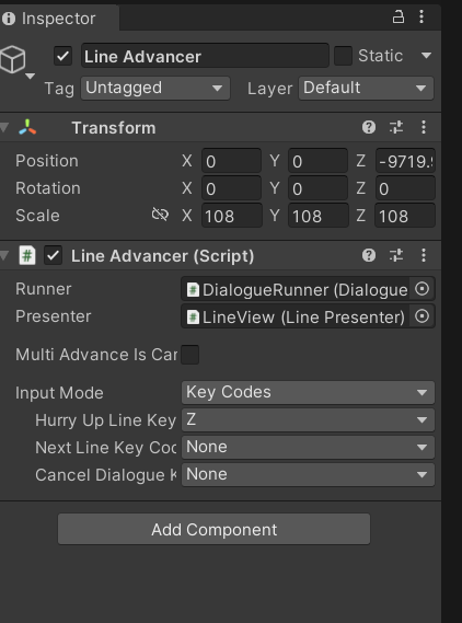 然后,将Line Advancer拖入DialogueRunner的DialoguePresenter里
