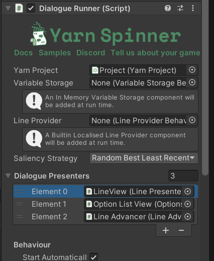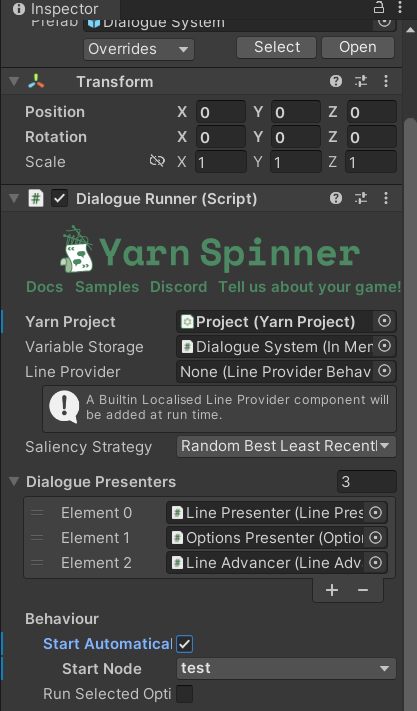 将Project赋值给Yarn Project,然后在Dialogue Runner的Behaviour部分中勾选Start Automaticall布尔值,StartNode选择test。