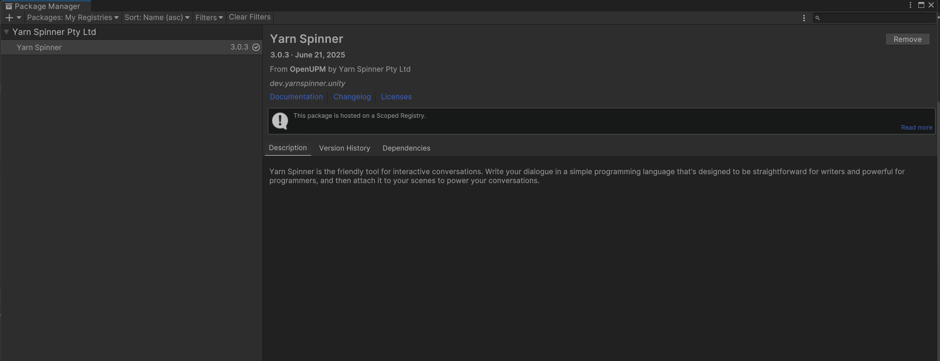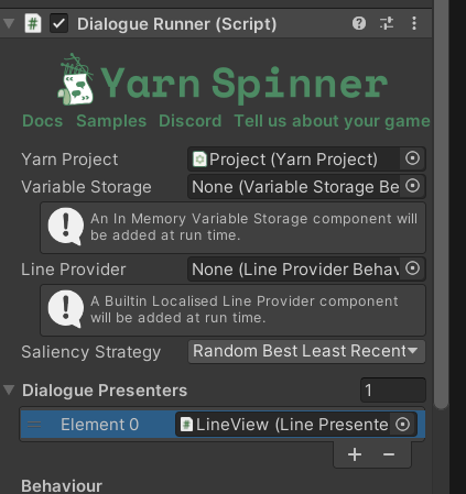 这个对话系统是YarnSpinner自带的,在Dialogue System对象的Dialogue Runner脚本中可以看到一个Yarn Project变量,将Project赋值给它。
