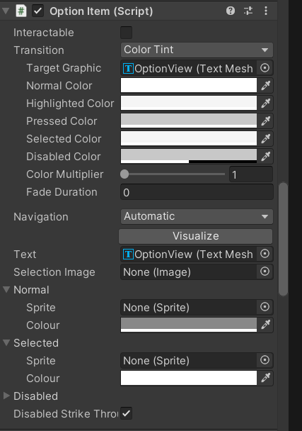 创建一个Text-MeshPro,起名为OptionView,为它添加一个Option Item脚本。