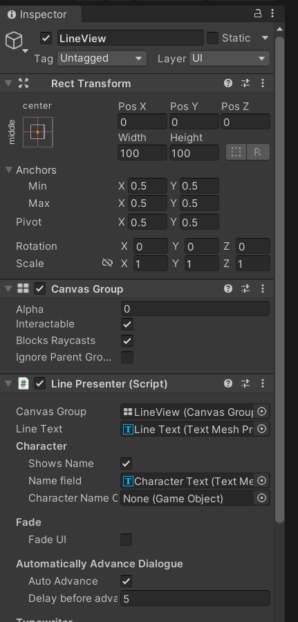 然后,将LineView拖入DialogueRunner的DialoguePresenter里