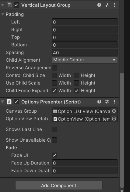 新建一个GameObject,命名为Option List View,添加Options Presenter,Vertical Layout Group和Canvas Group脚本。